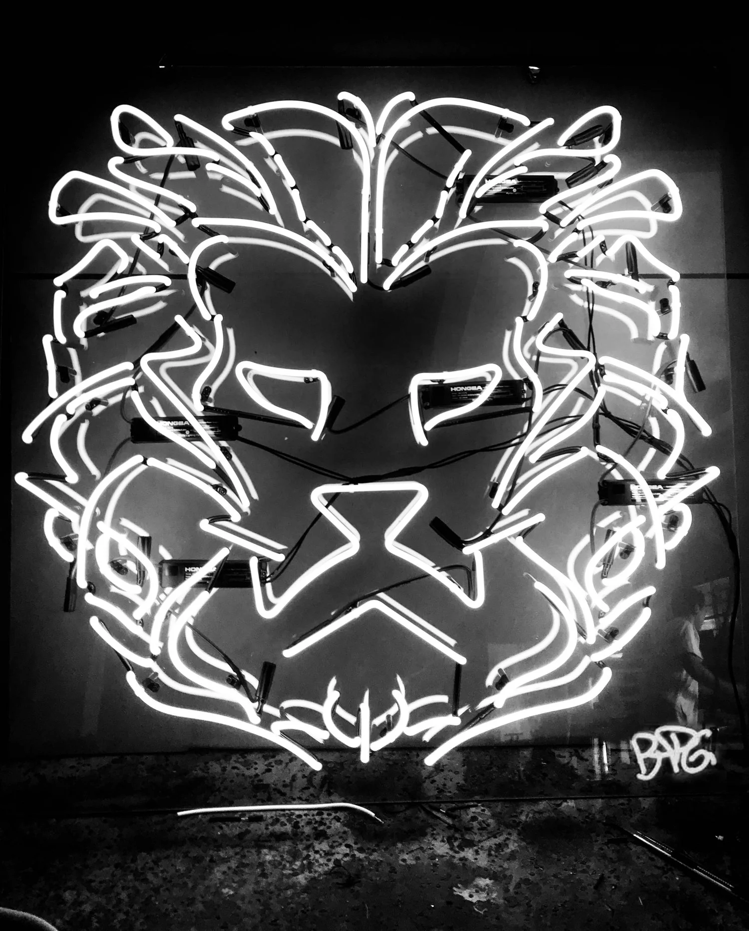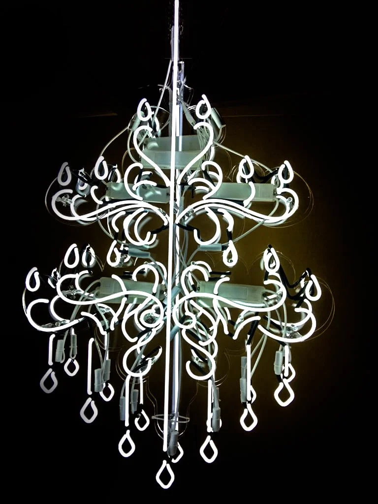 In addition to the paintings, there are a number of one of a kind Neon Art installations that make us re-think what’s possible with neon lights. Ranging from a 3-Dimensional Neon Chandelier to a one of a kind Kate Moss Wall hanging and the famous Gucci Ghost Logo re-imagined as a floating light.